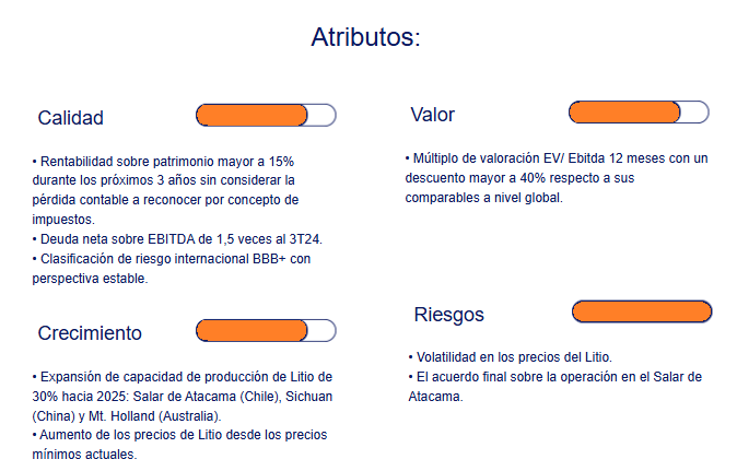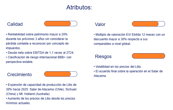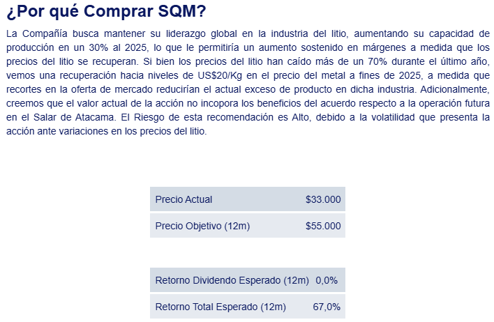- y aumentos en capacidad de producción de litio. El Riesgo de esta recomendación es Alto, debido a la volatilidad que presenta la acción ante variaciones en los precios del litio.
