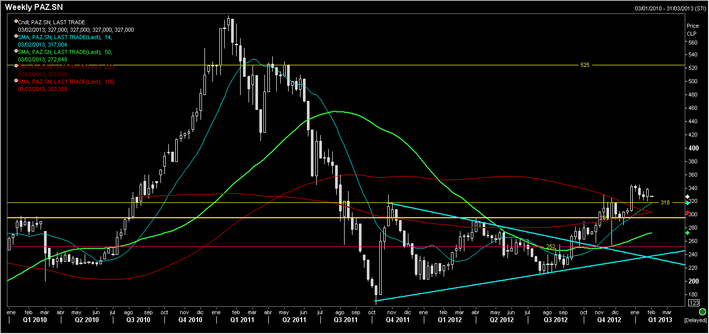 En estos momentos la acción está con una tendencia de largo plazo positiva, transando cercana a su media movil de 50 días en niveles de 318.-pesos. Si llegara a caer a estos niveles de 318 - 320.-pesos, es una posible buena zona como para hacer una primera compra.