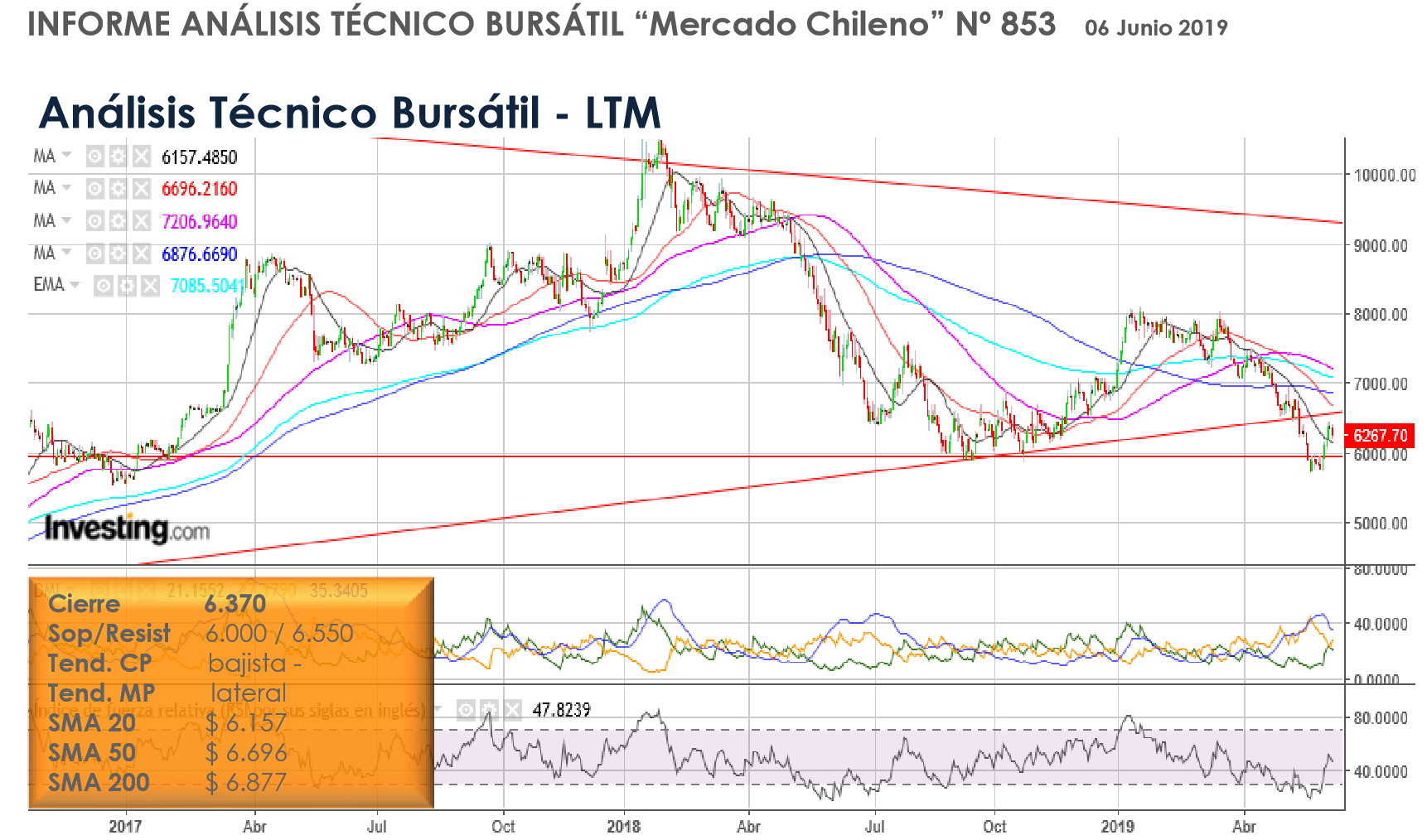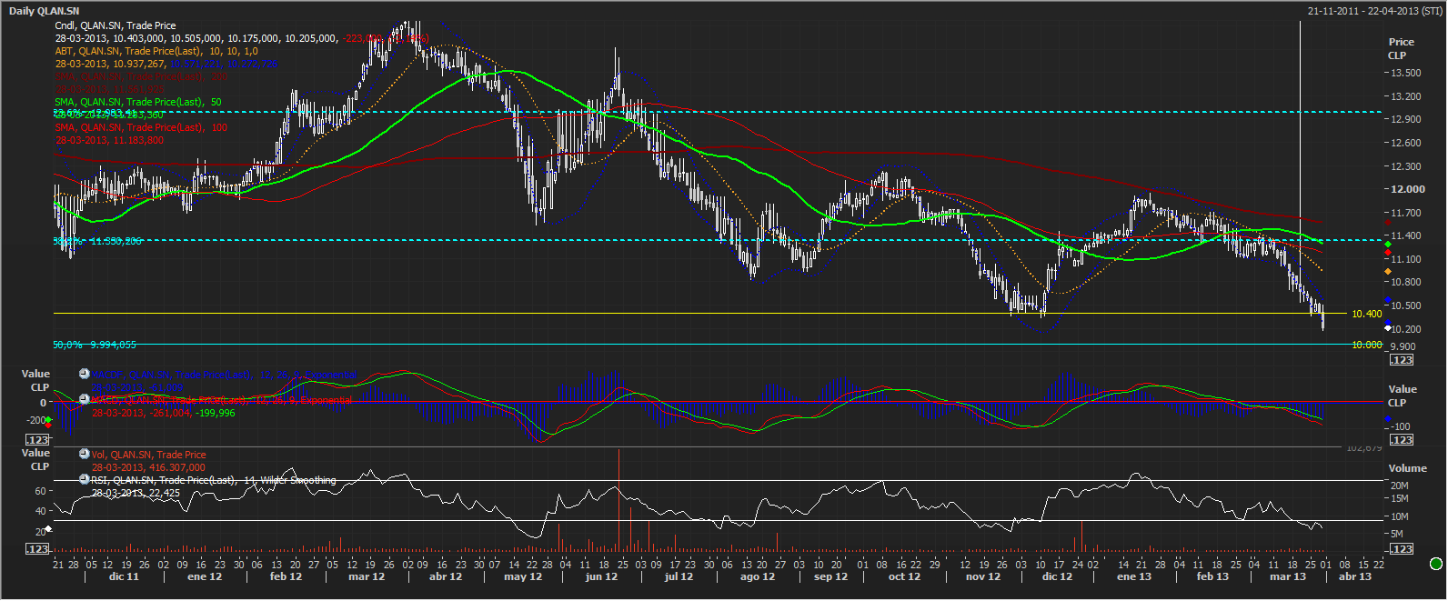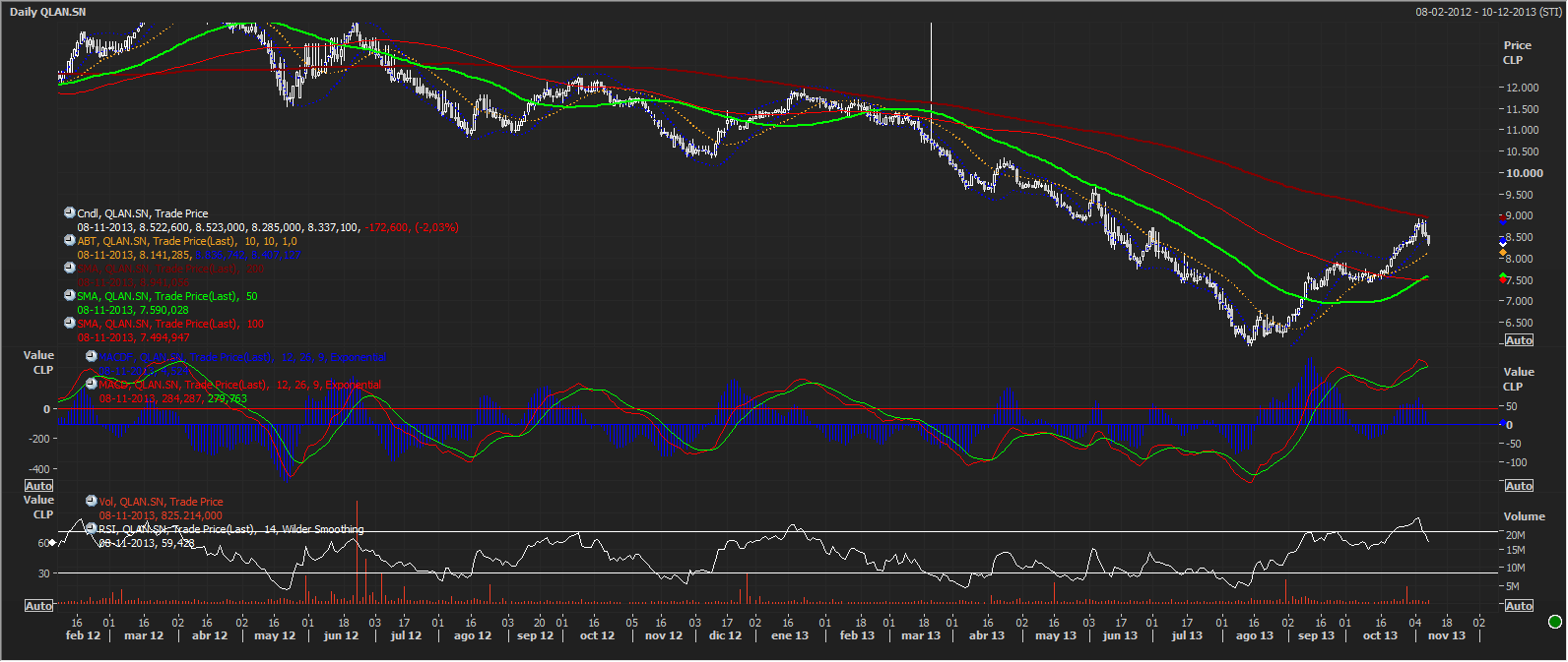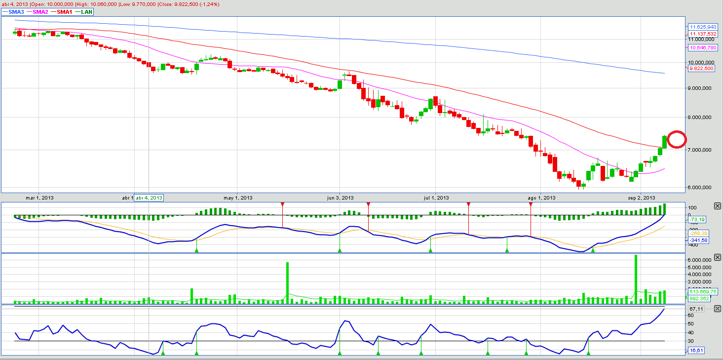 Las acciones de Lan llevan un buen rally desde sus niveles mínimos a mediados de Agosto cuando se encontraba en niveles de 6.000.-pesos. Actualmente la acción estaría rompiendo al alza la media móvil de 50 días, donde se supone debería salir algo de venta. Si bien el alza de hoy fue con un volumen promedio, para gatillar la señal de compra, necesitamos que la acción confirme la señal de compra de corto plazo. Para eso, es necesario que la acción transe durante al menos 3 días seguidos sin tocar los 7.000.-pesos. (ver círculo rojo en gráfico).