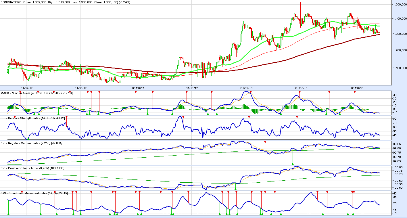 Actualmente la acción transa en su piso de largo plazo correspondiente a su media móvil de 200 días. ADX en niveles de 22 puntos indica que está en una etapa indeterminada, ya que no confirma tendencia ni tampoco zona de congestión. Generalmente cuando ADX muestra un valor entre 20 y 25 puntos no se debe tradear el papel. Sin embargo otros indicadores como el NVI (Negative Volume Index) y PVI (Positive Volume Index) nos indican que el papel está siendo acumulado tanto por inversionistas institucionales como por inversionistas retail. Recordemos que los inversionistas retail son aquellos más volátiles en su decisiones de acumulación o desacumulación en un papel, en cambio los institucionales o "smart money" son más constantes en sus decisiones de inversión y con mirada de largo plazo.