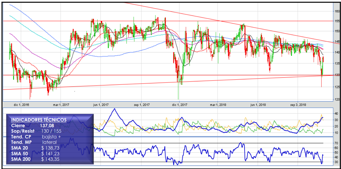 Dicho lo anterior, de todas formas el precio se encuentra transando bajo las medias móviles de 50, 100 y 200 períodos, indicándonos que la tendencia predominante es más bien a la baja. Un techo importante vendría ser la media móvil de 200 días que se encuentra en estos momentos en $128.-pesos.