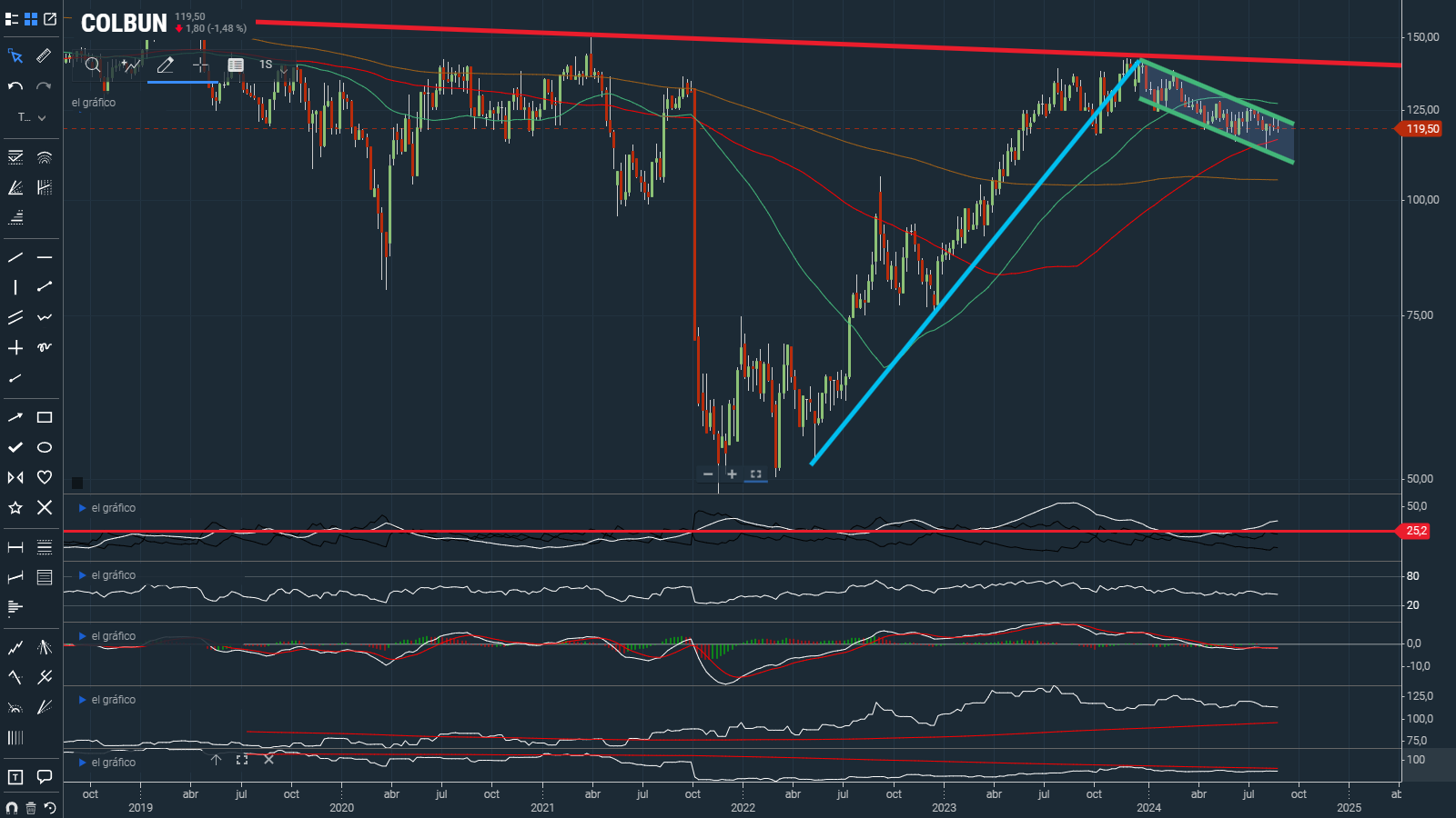 Al analizar el comportamiento a mediano plazo, podemos notar una larga tendencia alcista con un peak de precio en Diciembre 2024 para luego continuar dentro de un claro canal bajista mostrado por las líneas de tendencia en color verde. Dentro de la figura con corrección bajista, solo una ruptura al alza sobre los niveles de $124.-pesos, podría generar un retome de la tendencia alcista con poco espacio para correr, ya que tenemos muy cerca la media móvil de 200 días y luego el techo histórico en $140.-pesos.
