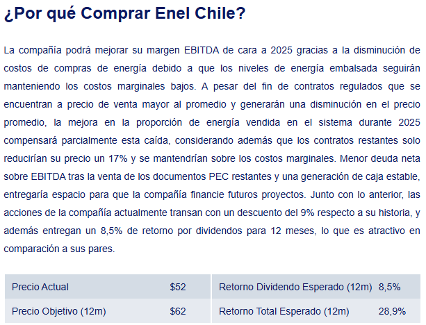 Enel Chile es una empresa que nace de la reestructuración de activos de Chilectra, Enersis y Endesa Chile dedicada a la generación y distribución de energía en el país. Actualmente el mayor accionista es la compañía italiana Enel con un 62%, luego inversionistas institucionales con un 19% y finalmente las AFP’s y ADR con un 13% y 5% respectivamente. Su capacidad instalada es de más de 6.5 Ghw y divide su producción en hidroeléctrica, petróleo y gas, carbón y energía renovables no convencionales.