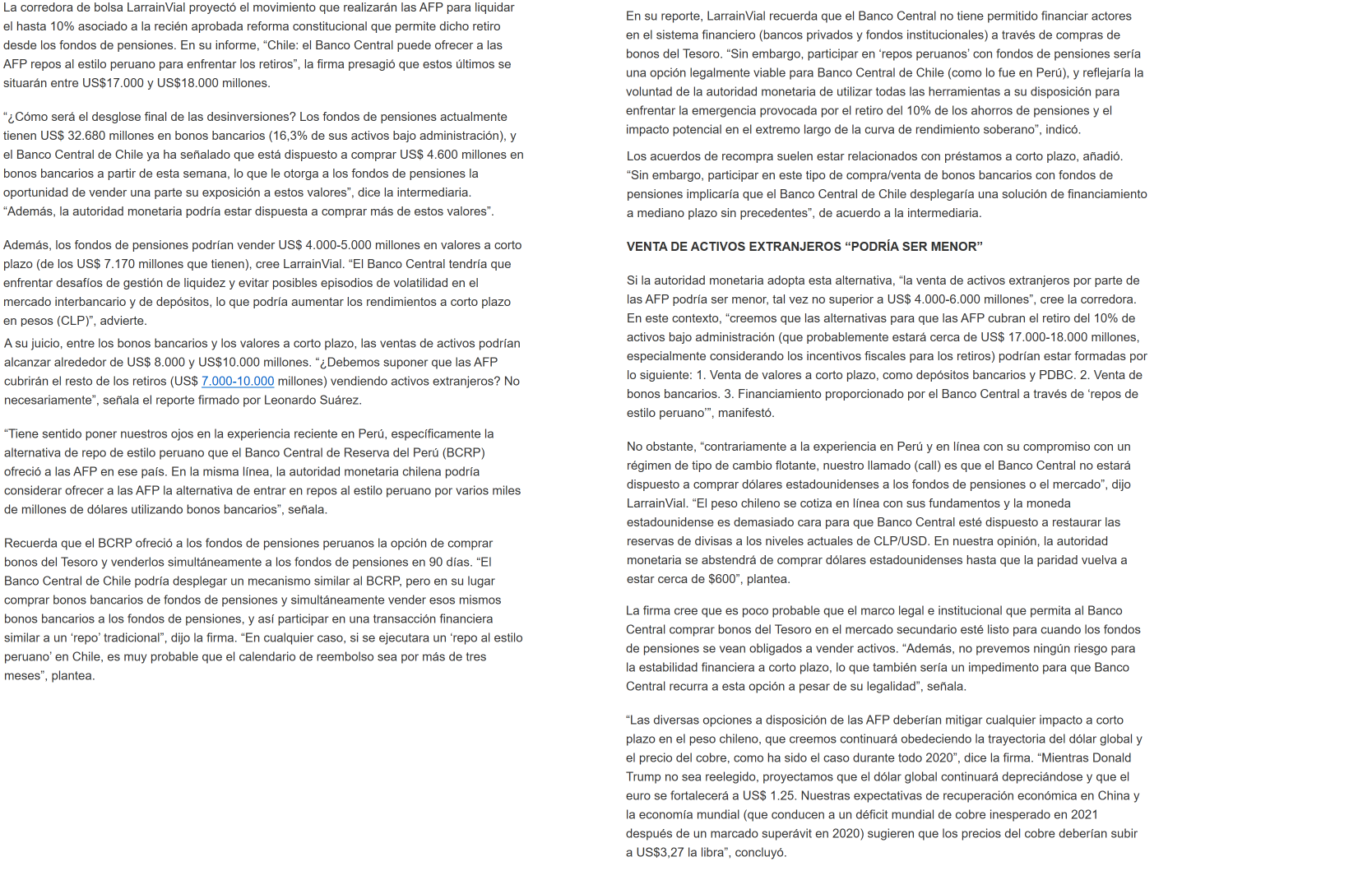 La fórmula que utilizarían las AFP para liquidar el 10%, según LarrainVial publicado por El Mercurio.