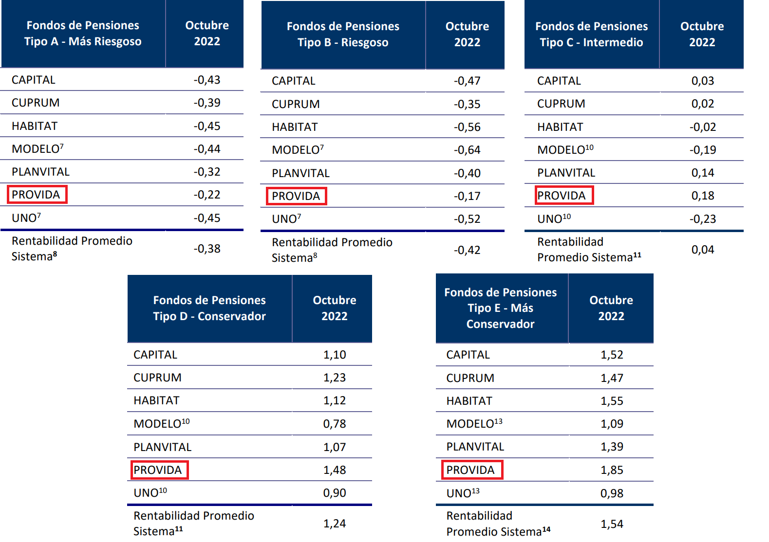 Claramente, durante el mes de Octubre 2022, AFP PROVIDA fue la gran ganadora obteniendo la mejor rentabilidad en todos los fondos. Si bien en el fondo A y B obtuvieron pérdida, esta fue la menor obtenida entre todas las AFP. Cabe destacar, que la diferencia de rentabilidad que obtuvo PROVIDA frente al resto de las AFP es muy destacable en la mayoría de los fondos.