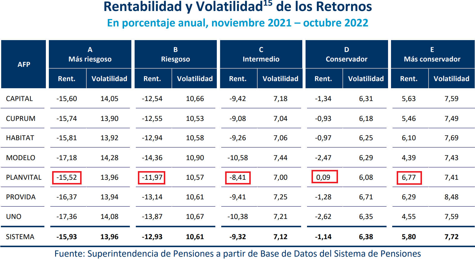 Como se puede ver en el cuadro anterior, la rentabilidad acumulada desde Enero 2022 a la fecha, todos los fondos de la AFP han tenido pérdida a excepción del fondo E. En los últimos 12 meses el rendimiento real sigue siendo muy malo, salvo el E. Todos los fondos de la AFP presentan pérdidas reales que van desde -1,14% a -15,93%, a excepción del Fondo E que mantiene un desempeño destacable de 5.80% en los últimos 12 meses.