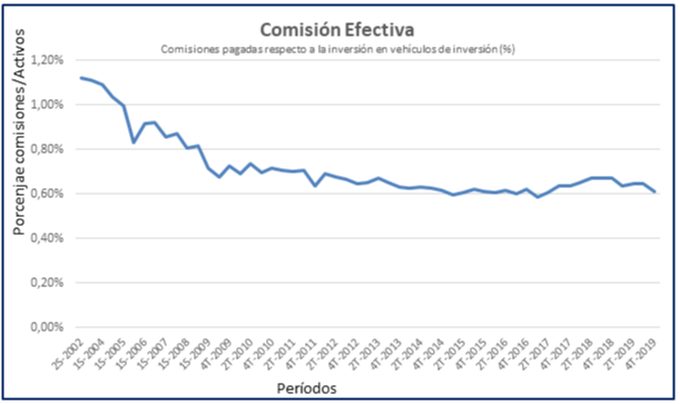 Además, las comisiones efectivamente pagadas por los fondos de pensiones a vehículos de inversión han ido disminuyendo en el tiempo, pasando desde un 1,12% en 2002, a un 0,61% de la inversión en 2019. Esto se puede observar en el siguiente gráfico: