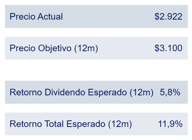 A pesar de que las acciones de la embotelladora mantienen un nivel de valoración menor a su promedio histórico (múltiplo VE / EBITDA 2024E de 5,7 veces), las perspectivas de crecimiento de largo plazo para la compañía no sustentarían un cambio de recomendación. De todas formas, los resultados operacionales de Andina serían respaldados por la resiliencia de su estrategia de precios, junto con un mayor tipo de cambio USD/CLP para el periodo. Además, la compañía cuenta con un balance saludable que les permite tener un retorno por dividendos cercano al 6%.