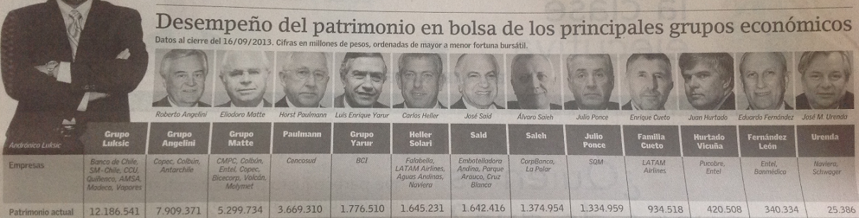 Resúmen de las principales compañías de las que son dueños los distintos grupos económicos en chile. Valorización de sus empresas al 16/09/2013