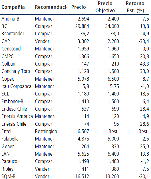 Precios objetivos para acciones chilenas al 22 Agosto 2016 por Banchile.