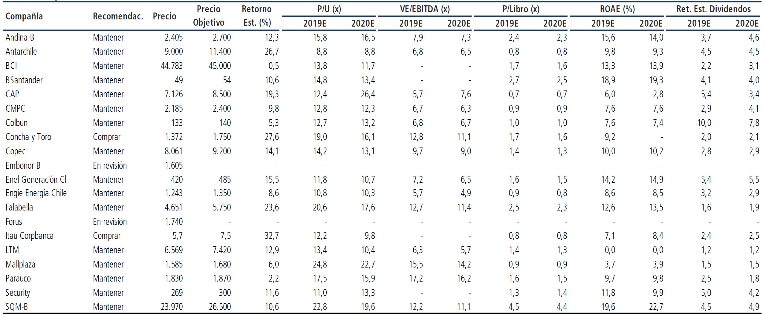Recomendación y Precios Objetivos al 10/5/2019 por Banchile.