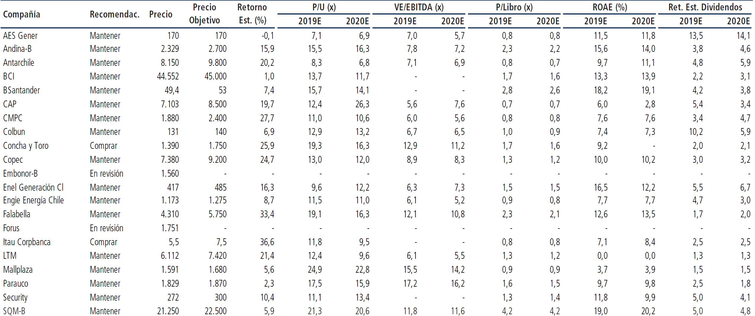 Recomendación y Precios Objetivos al 31/5/2019 por Banchile.