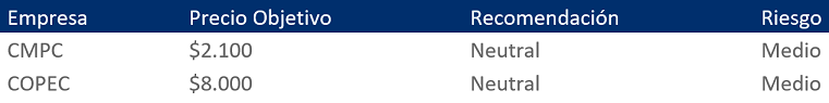 Actualización al 3/6/19. Se materializa el escenario pesimista de precios de celulosa – Reduciendo precios objetivos para las acciones de CMPC y COPEC a $2.100 y $8.000, respectivamente.