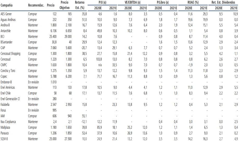 | Recomendación y Precios Objetivos al 04/09/2020 por Banchile http://www.chatbolsa.cl/viewtopic.php?f=6&t=755 |