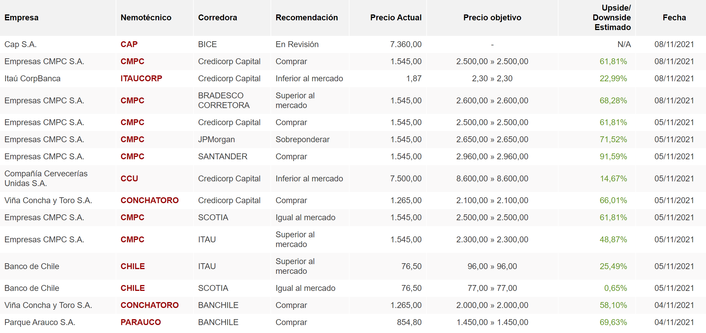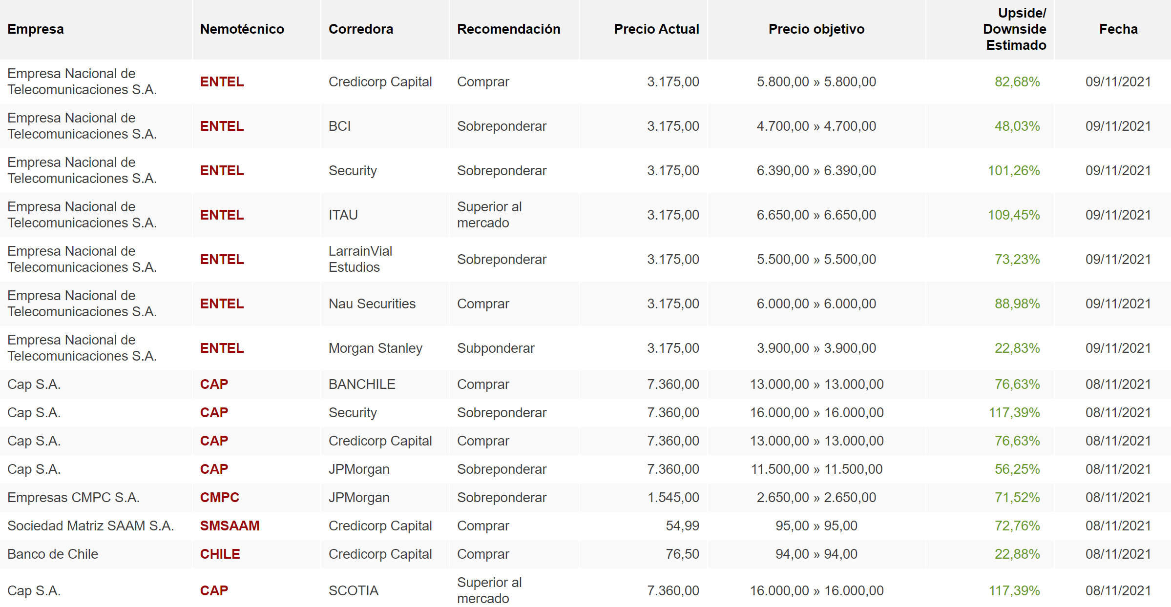 Ultima Actualización de Precios Objetivos Acciones Chilenas publicadas durante los primeros 10 días del mes de Noviembre 2021, por EMOL.