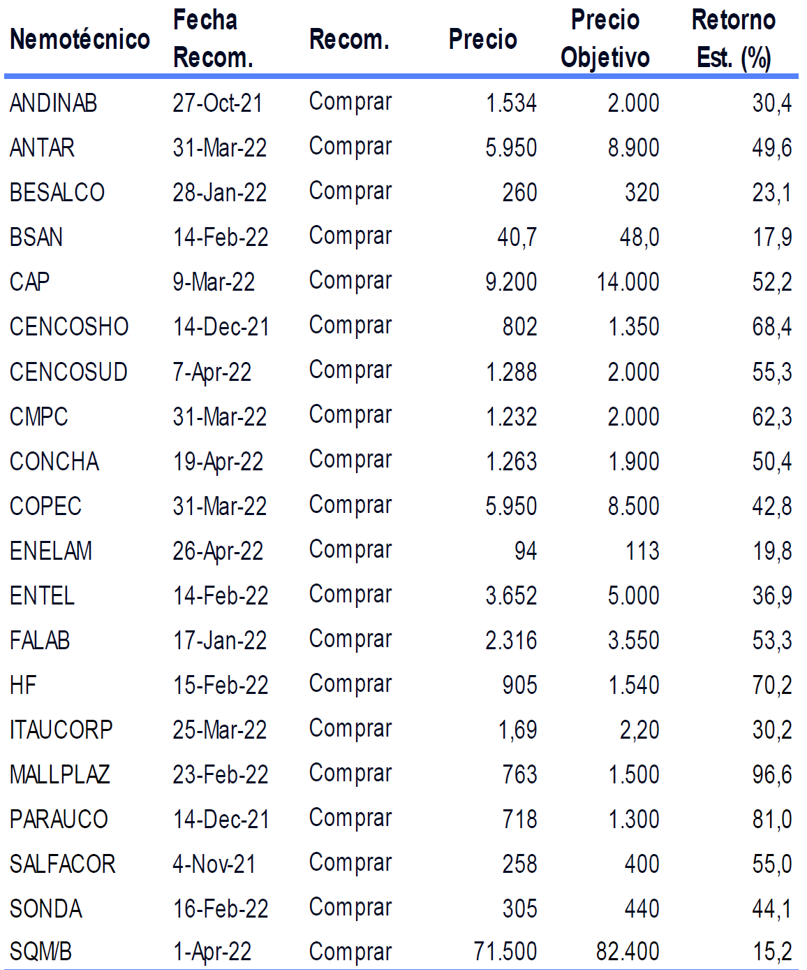 Precios Objetivos al 13/05/2022 por Banchile.