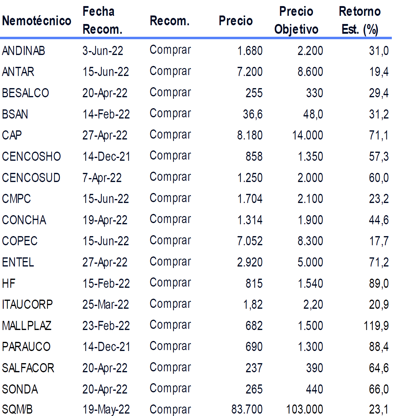 Precios Objetivos al 15/07/2022 por Banchile.
