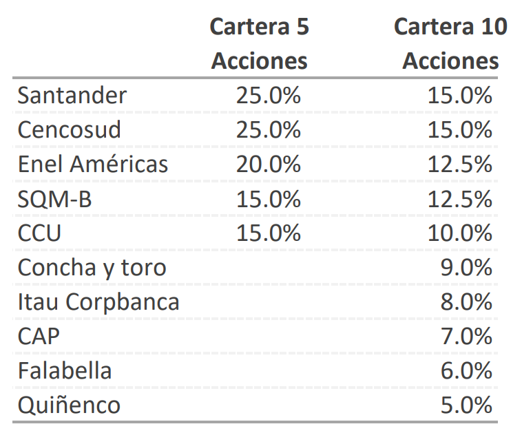 En el cuadro anterior se puede observar las Carteras Recomendadas por BICE Inversiones para las Acciones Locales Chilenas. El cuadro muestra los porcentajes que se deberían invertir en cada acción dependiendo del nivel de diversificación que se quiera lograr. Para un portfolio más agresivo o para montos bajos de inversión se recomienda el portafolio de 5 acciones. En el caso que se busque una mayor diversificación y para montos más altos de inversión se recomienda el portfolio de 10 acciones.