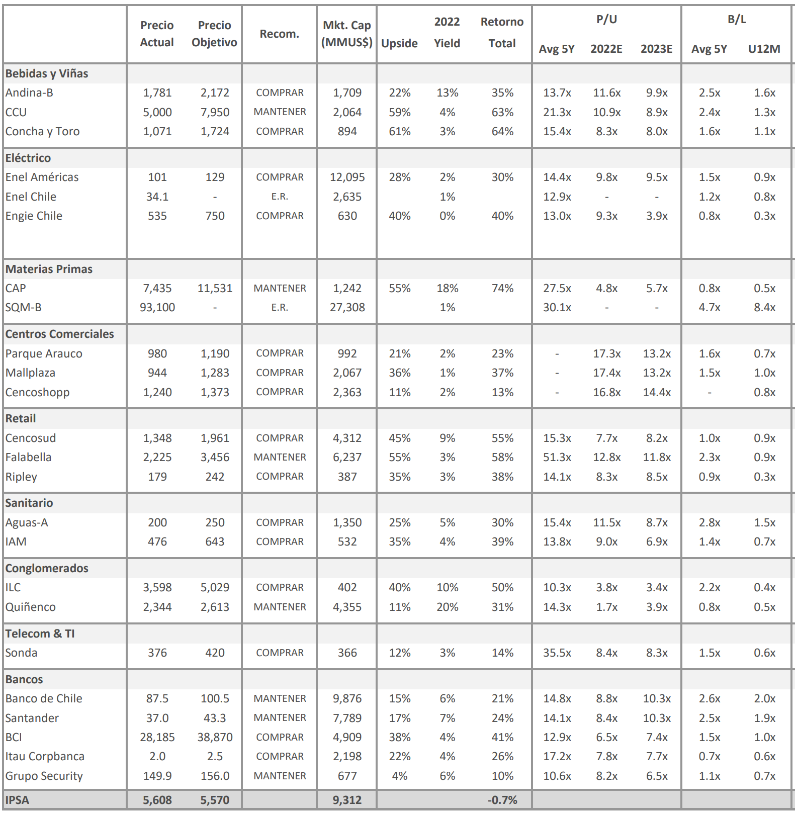 Recomendación y Precios Objetivos al 07/09/2022 por BICE Inversiones.