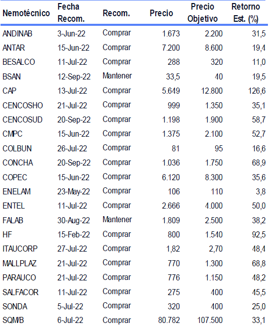 Precios Objetivos Acciones Locales al 14/10/2022 por Banchile.