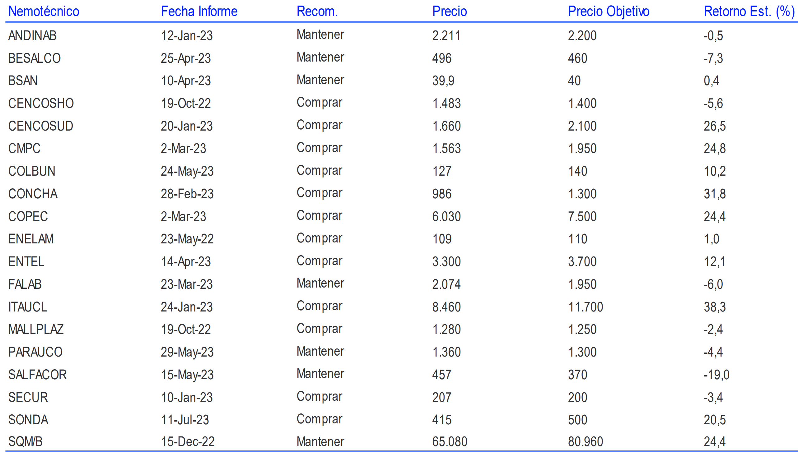 Precios Objetivos Acciones Locales por Banchile al 14 de Julio 2023.