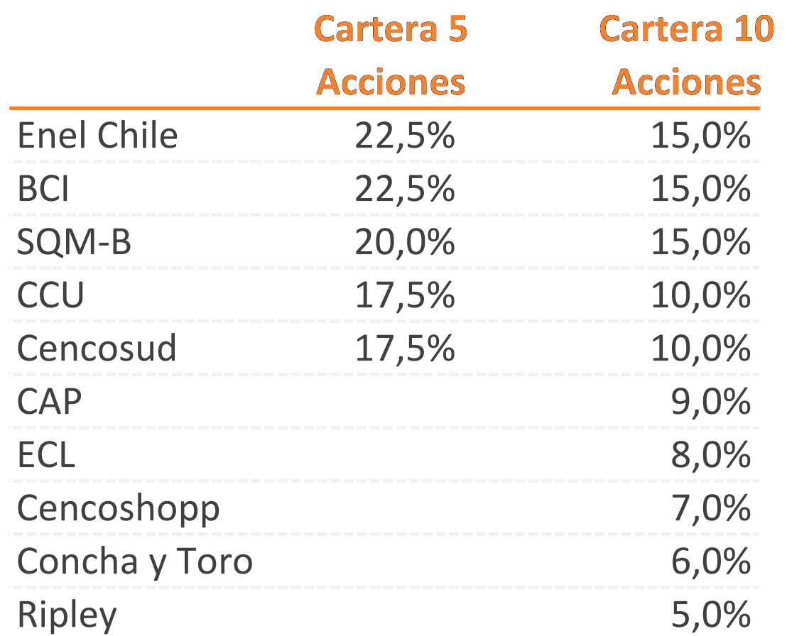 En el cuadro anterior se puede observar las Carteras Recomendadas por BICE Inversiones para las Acciones Locales Chilenas actualizado al 6 de Diciembre 2023. El cuadro muestra los porcentajes que se deberían invertir en cada acción dependiendo del nivel de diversificación que se quiera lograr. Para un portfolio más agresivo o para montos bajos de inversión se recomienda el portafolio de 5 acciones. En el caso que se busque una mayor diversificación y para montos más altos de inversión se recomienda el portfolio de 10 acciones.