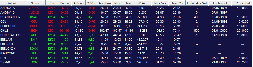 Valor y resumen de las acciones de compañías chilenas en el mercado de Nueva York al 12/04/18.