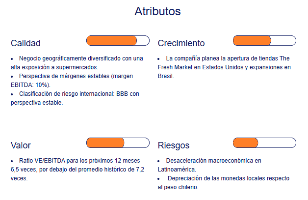Luego de la noticia que la compañía adquiriría Carrefour Colombia, la acción hay caído desde niveles de $2.776,9 a $2.535.-pesos en solo 2 días. Luego salió Feller Rate diciendo que con esta noticia, pone la deuda de la compañía en Creditwatch negativo haciendo más pronunciada la caída de su precio. Los que operamos diariamente sabemos que los efectos de una noticia así suele durar 2 o 3 días seguidos. Con la baja de hoy, se rompió el piso de $2.630.-pesos para ahora ir a buscar los $2.500.-pesos.